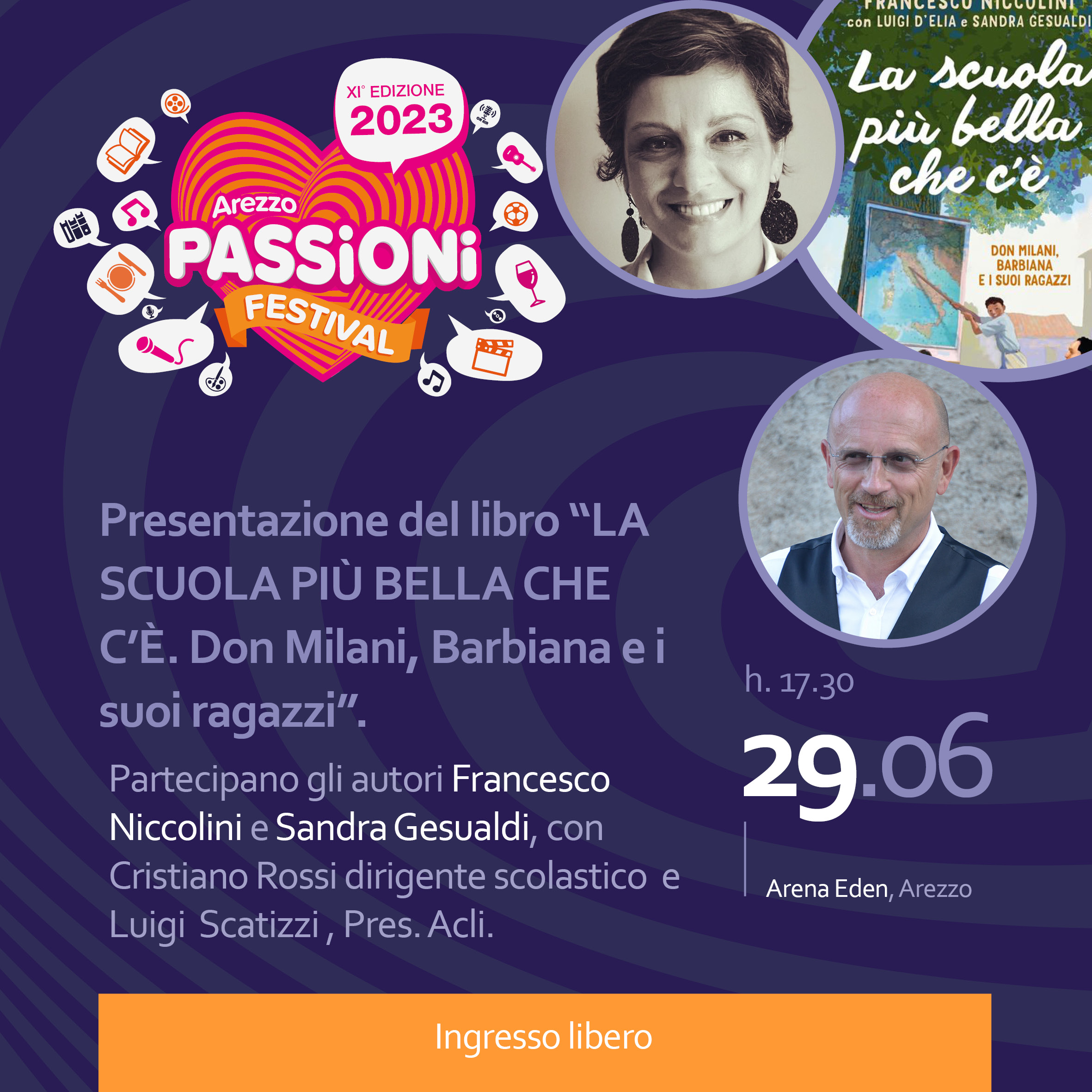 Alle 17:30, all’Arena Eden, l’autore e scrittore Francesco Niccolini, insieme a Sandra Gesualdi, presenterà il suo ultimo libro “La scuola più bella che c’è. Don Milani, Barbiana e i suoi ragazzi”, una biografia che racconta la vita e l’opera del prete più spigoloso e rivoluzionario della nostra epoca: una storia di scontri, amarezze, sconfitte, ma anche di un grande amore per la vita, per i più deboli, per i bambini.