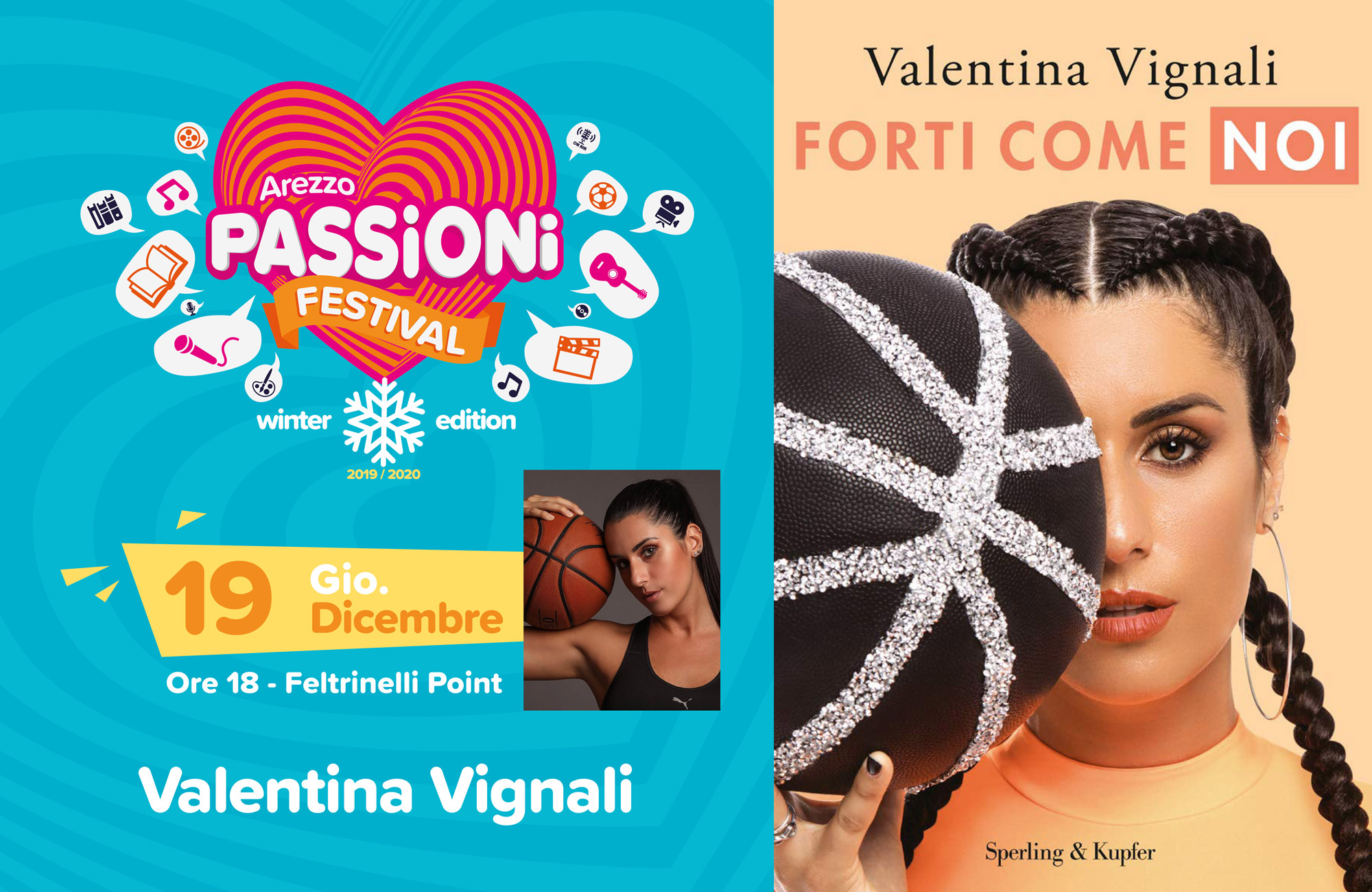 La chiusura del 2019 del Passioni Festival è in programma alla Feltrinelli Point di Arezzo alle 18 di giovedì 19 dicembre. Salirà sul palco Valentina Vignali. Cestista 28enne, ha esordito in Serie A2 ad appena 16 anni, con la maglia del Cervia. Ala di 183 centimetri, dopo la stagione 2018/2019 in forza all’Athena Roma (A2), dallo scorso settembre è tesserata con la Smit Centro Roma (Serie B). Parallelamente all’attività sportiva, negli anni, ha portato avanti anche quella di modella, partecipando anche a Miss Italia. Testimonial di numerose campagne pubblicitarie, ha preso parte a varie trasmissioni televisive sia sportive (ha condotto “Sotto canestro su La7 e “SI Basket” su Sportitalia) che non (“Uomini e donne”, “Lucignolo”, “Giovani e influencer”, “Grande fratello 16” tra Mediaset e Rai). Personaggio social seguitissimo, nel suo libro “Forti come noi” (Sperling & Kupfer) racconta personali vicissitudini, tra cui il tumore che l’ha colpita, imponendole cure debilitanti. Nella pagine Valentina spiega anche la successiva lotta per potersi allenare ancora e tornare a calcare un parquet di basket.
